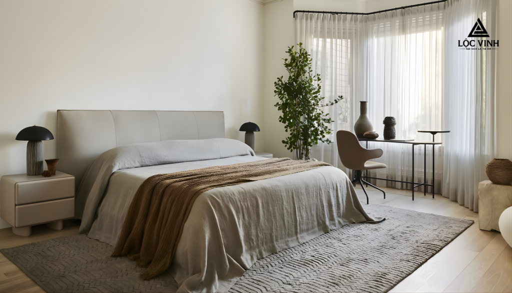 - Trang trí tối giản nhưng có điểm nhấn: chẳng hạn chăn len dệt thô, thảm lông ngắn, vài cây xanh nhỏ.