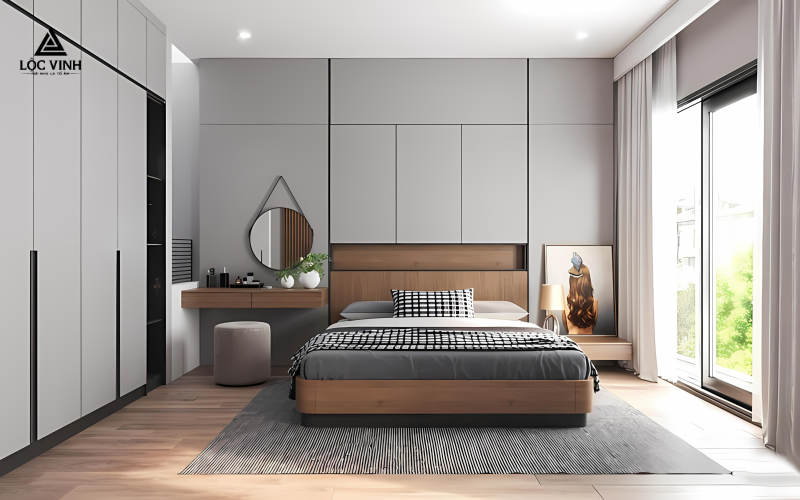 - Sàn có thể là gỗ tự nhiên màu trung tính hoặc lát đá/vật liệu cao cấp kèm thảm lót đầu giường.