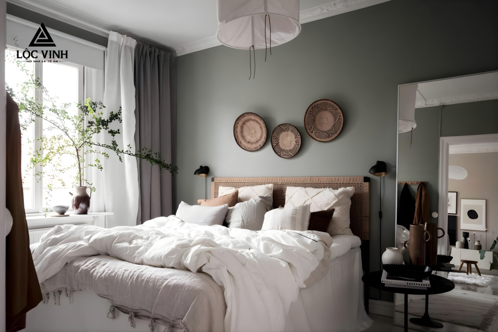 Với phòng ngủ trung bình đến lớn, bạn có thể thêm các chi tiết nhấn như tường ốp gỗ sáng, đèn treo kiểu Bắc Âu, ghế đọc sách bọc vải len, hoặc thảm dệt thủ công để tăng cảm giác ấm và tinh tế. Nếu cửa sổ quá lớn, bạn có thể thay rèm nặng bằng rèm nhẹ hoặc màn dệt mỏng để tận dụng ánh sáng.
